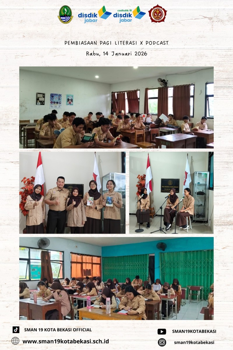 SMAN 19 KOTA BEKASI terus berkomitmen menumbuhkan budaya literasi melalui kegiatan Pembiasaan Pagi Literasi Membaca Buku yang disiarkan melalui podcast sekolah. Kegiatan ini dilaksanakan secara rutin pada pagi hari sebelum pembelajaran dimulai dan diikuti oleh peserta didik dengan pendampingan guru.