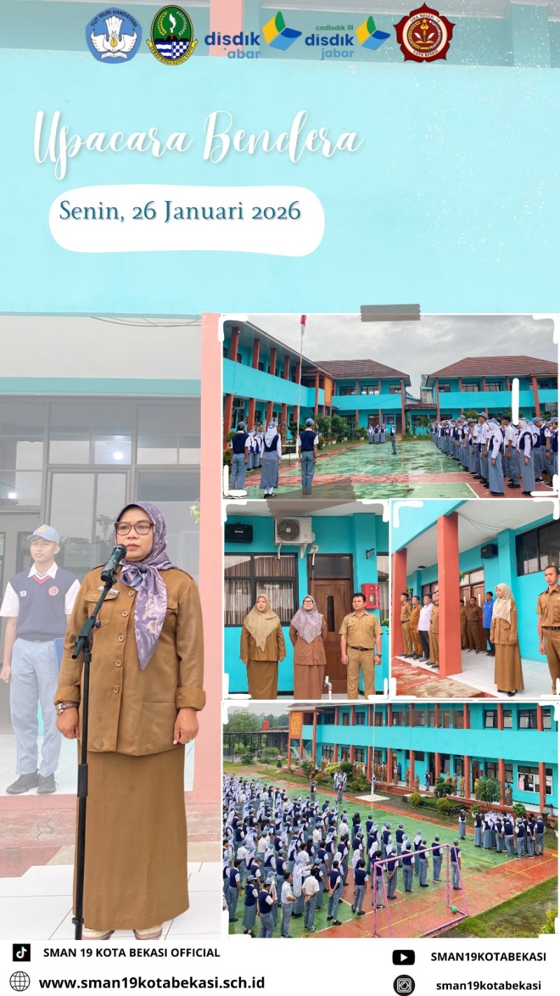SMA Negeri 19 Kota Bekasi melaksanakan kegiatan upacara bendera yang dirangkaikan dengan pembacaan Ikrar Pelajar Indonesia pada Senin, 26 Januari 2026 di halaman sekolah. Kegiatan ini diikuti oleh seluruh peserta didik, guru, dan tenaga kependidikan dengan tertib dan khidmat.