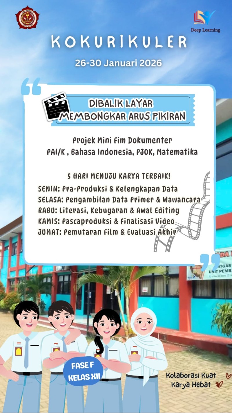 Penguatan pembelajaran kokurikuler berbasis deep learning, SMA Negeri 19 Kota Bekasi melaksanakan kegiatan Kokurikuler yang berlangsung pada 26 – 30 Januari 2026. Kegiatan ini mengusung tema “Di Balik Layar, Membongkar Arus Pikiran” dalam bentuk Proyek Mini Film Dokumenter yang diikuti oleh peserta didik Fase F Kelas XII.