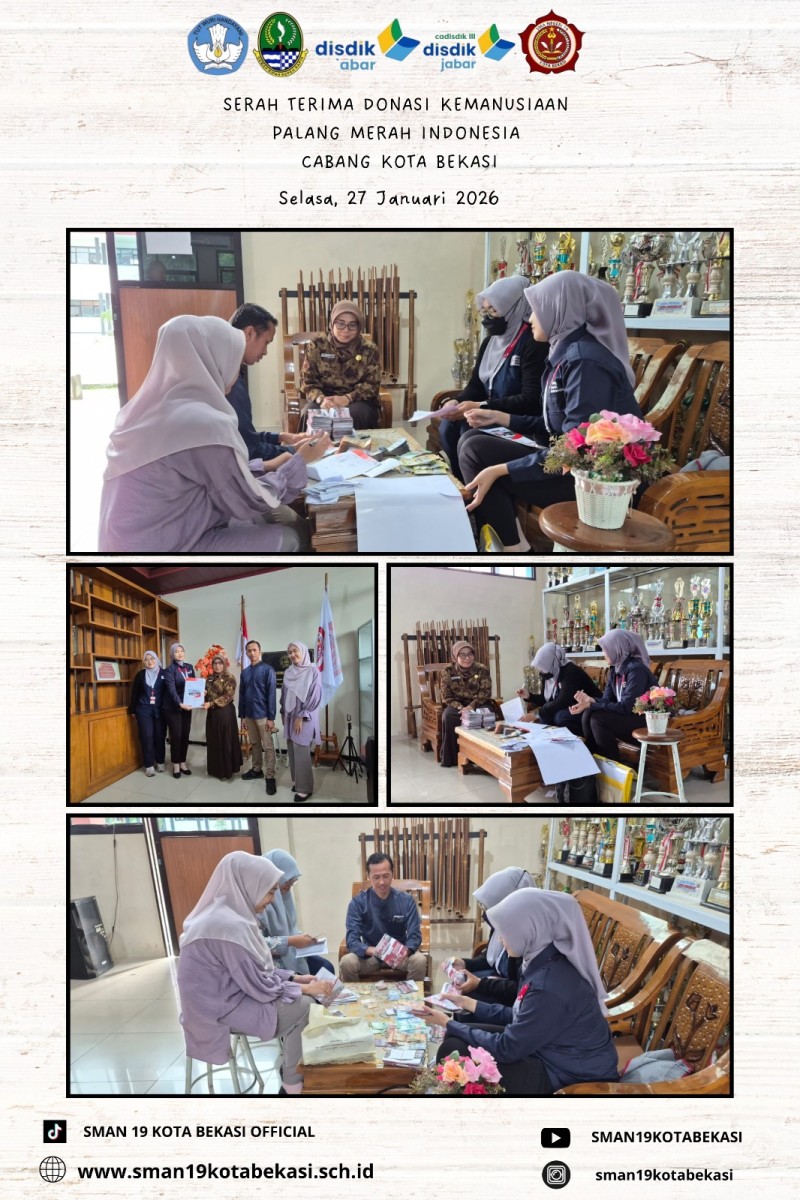 Sebagai wujud kepedulian sosial dan solidaritas kemanusiaan, SMA Negeri 19 Kota Bekasi melaksanakan kegiatan serah terima donasi kemanusiaan kepada Palang Merah Indonesia (PMI) Cabang Kota Bekasi pada hari Selasa, 27 Januari 2026.