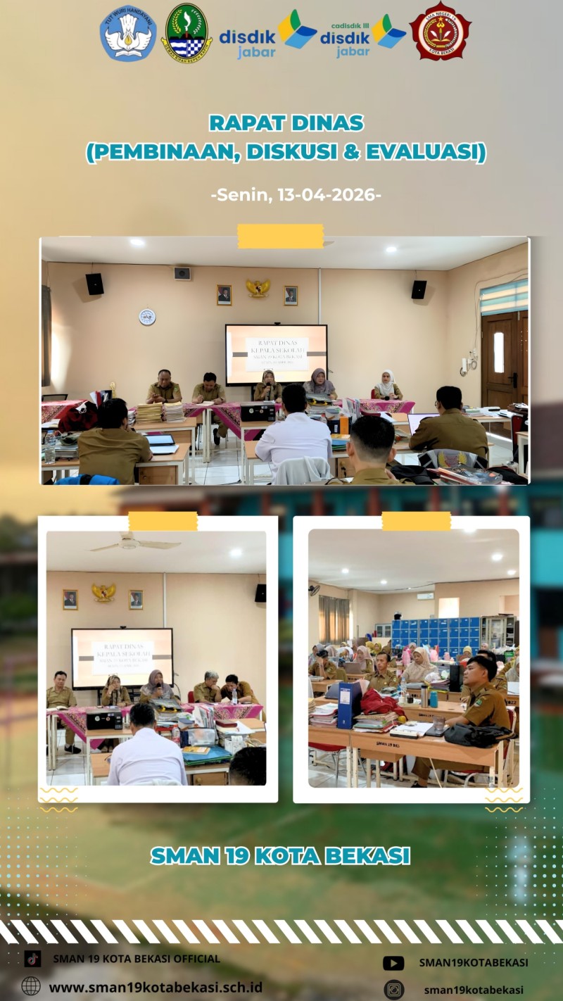 Kepala SMAN 19 Kota Bekasi memberikan pembinaan kepada seluruh guru sebagai upaya meningkatkan kualitas pelaksanaan kegiatan belajar mengajar (KBM) serta penguatan karakter di lingkungan sekolah. Kegiatan ini dilaksanakan pada hari Senin, 13 April 2026 dan diikuti oleh seluruh warga sekolah baik guru, tenaga kependidikan, maupun caraka meliputi beberapa sektor yang terlibat dalam lingkungan sekolah.